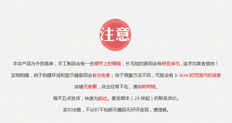 玩具因为剪裁复杂,材质又是软的。所以很多工序只能靠人手工...一般都稍有瑕疵,面部不对称,整体不饱满,四肢站不稳(以上都是正常情况)大部分玩具为长毛绒,生产过程就有浮毛,会有明显掉毛情况,掉毛,掉毛,不适合小孩子。如果你有任何一条不能接受的请不要购买。购买前请三思。 |