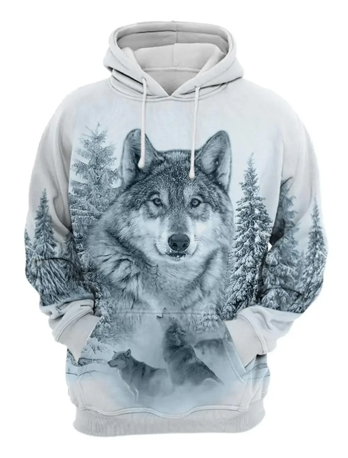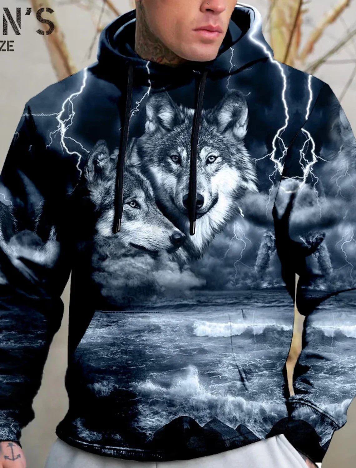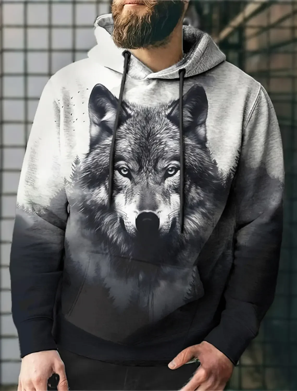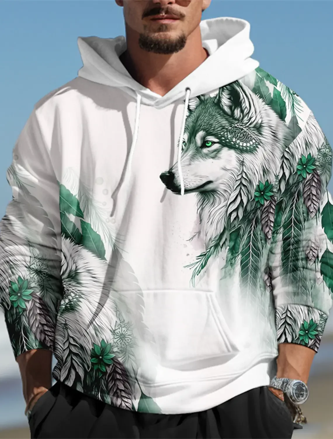 Wolf Graphic Men's 3D Print Pullover Streetwear Hoodies Dark Green Long Sleeve Hooded Spring & Fall Designer Top